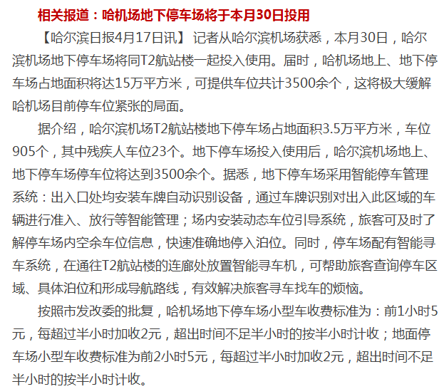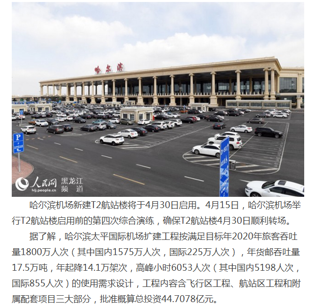 哈尔滨机场T2航站楼将于4月30启用,配建3500余车位!
