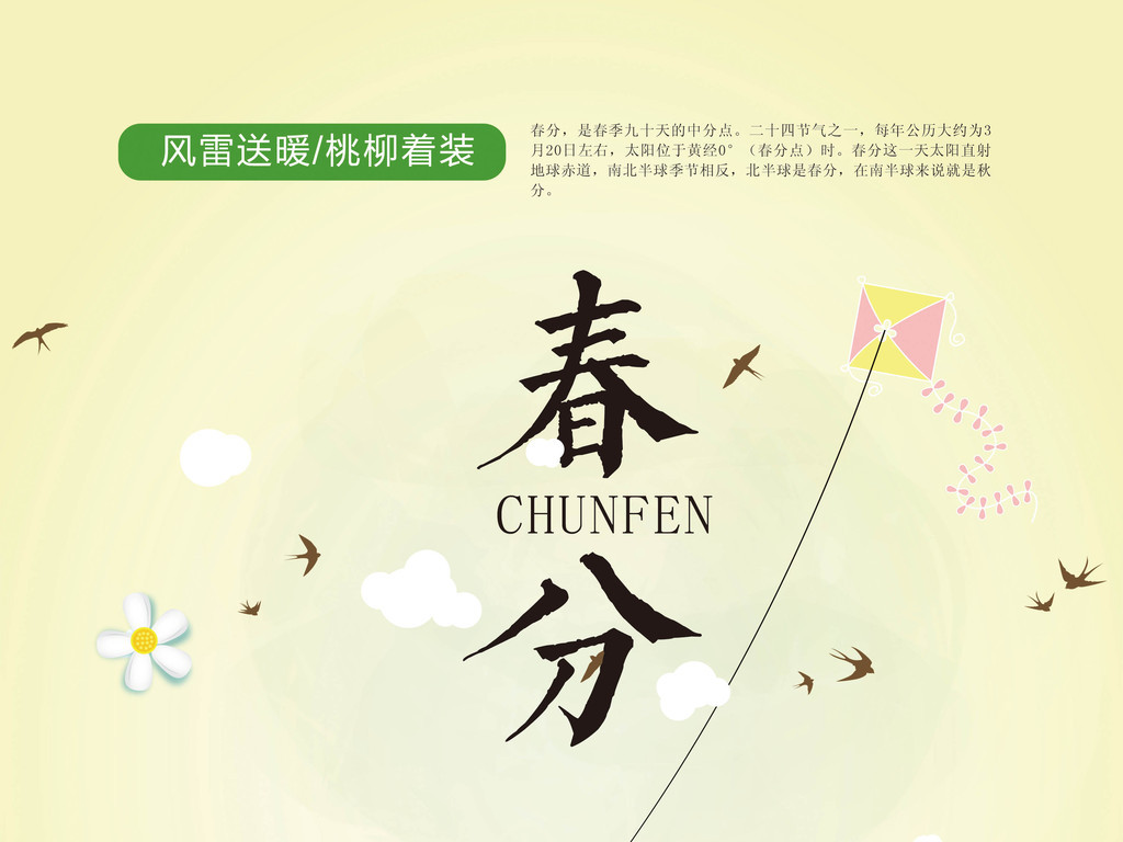 春分这一天,太阳几乎直射地球赤道,全球各地几乎昼夜等长。春分过后,太阳直射点开始进入北半球,北半球各地开始昼长夜短。春分是个比较重要的节气,它不仅有天文学上的意义:南北半球昼夜平分,在气候上,也有比较明显的特征,春分时节,我国除青藏高原、东北、西北和华北北部地区外都进入明媚的春天,在辽阔的大地上,杨柳青青、莺飞草长、小麦拔节、油菜花香。