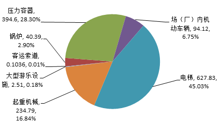 截至2018年底,全国特种设备总量达1394.35万台。其中:锅炉40.39万台、压力容器394.6万台、电梯627.83万台、起重机械234.79万台、客运索道1036条、大型游乐设施2.51万台(套)、场(厂)内机动车辆94.12万台。另有:气瓶1.5亿只、压力管道47.82万公里。(见图1)