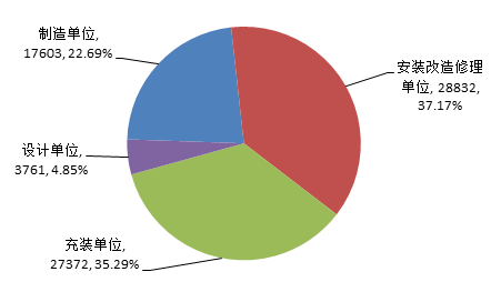 截至2018年底,全国共有特种设备生产(含设计、制造、安装、改造、修理、气体充装)单位76925家(见图2),持有许可证79175张,其中:设计单位3761家,制造单位17603家,安装改造修理单位28832家,移动式压力容器及气瓶充装单位27372家。特种设备作业人员持证1216.67万张。
