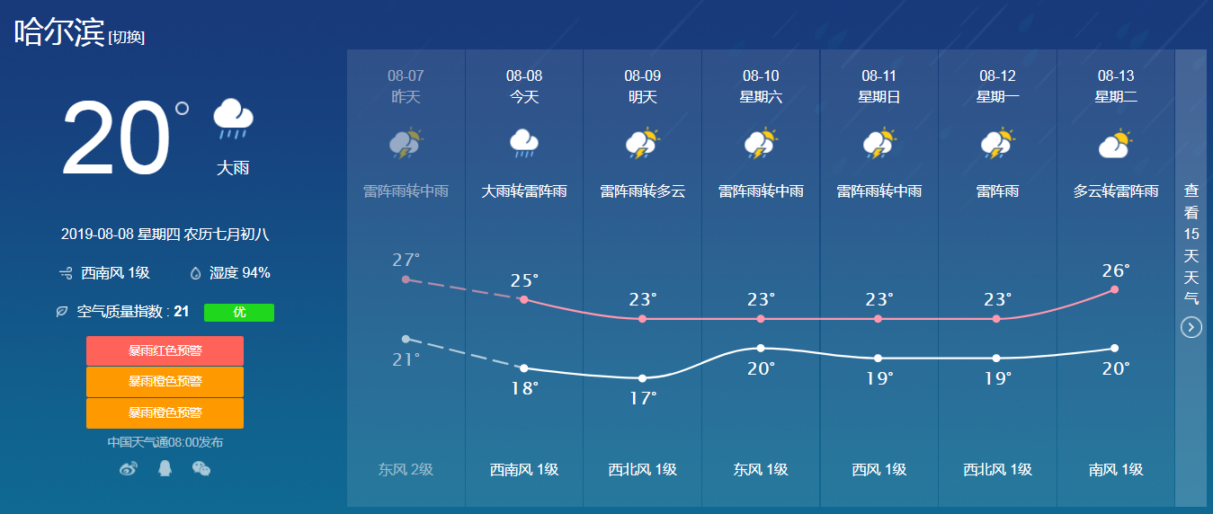 7日白天全市阵雨或雷阵雨,其中东北部(通河、依兰、方正、尚志、延寿)降雨更明显,易出现短时强降水而造成局地暴雨;夜间全市中雨,其中,北部(呼兰、巴彦、木兰、通河)和东部(方正、延寿、尚志、依兰)大雨,全市局地暴雨;8日白天全市大雨,局地暴雨,整体形势稍偏北。夜间全市雷阵雨,其中北部(巴彦、木兰、通河、依兰、方正)中雨,局地暴雨;9日全市阵雨或雷阵雨,局地雨量可达中雨程度;10日白天全市阵雨或雷阵雨,傍晚至夜间全市大雨,局地暴雨;11日西部(双城、哈尔滨、呼兰、阿城、宾县、巴彦、木兰、五常)中雨,全市阵雨或雷阵雨,局地中雨;12日全市以多云天气为主,伴有分散性阵雨或雷阵雨;13日白天全市雷阵雨,夜间全市中到大雨。