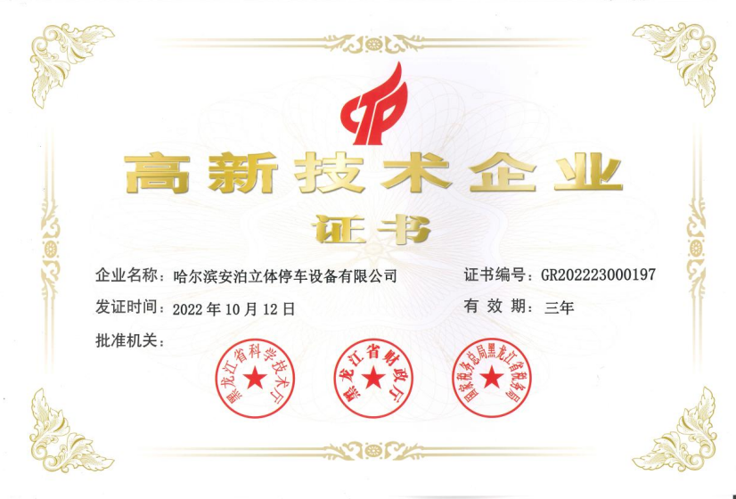我司-哈尔滨安泊立体停车设备有限公司顺利通过高新技术企业认证,荣获国家高新技术企业殊荣,这标志着我公司迈上了一个全新的台阶,对公司未来的发展具有里程碑式的意义。